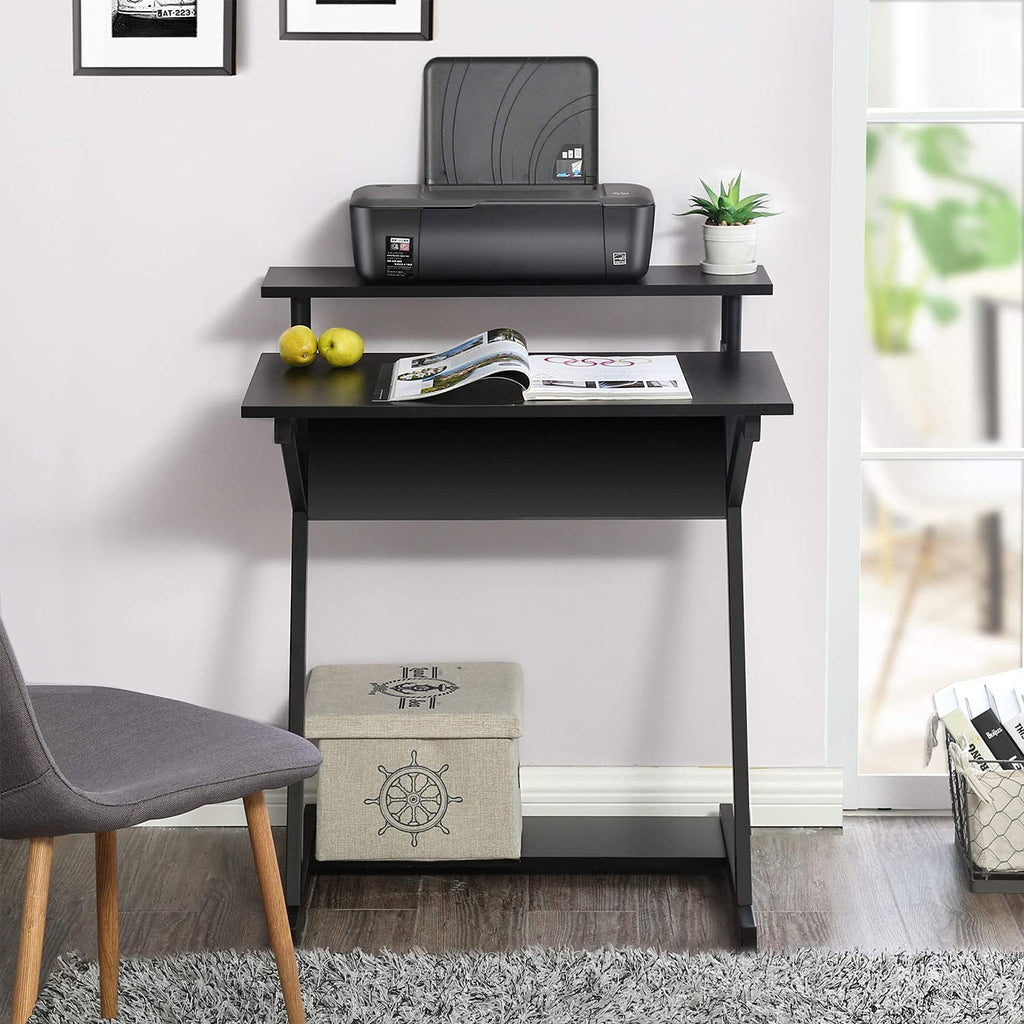 The layered design of the table makes full use of the space. The top shelf design puts your monitor at the proper viewing height and the keyboard and mouse at the proper working height,reduced back and neck pain. The lower platform to put books, printer and computer mainframe. Totally maximize your storage space.