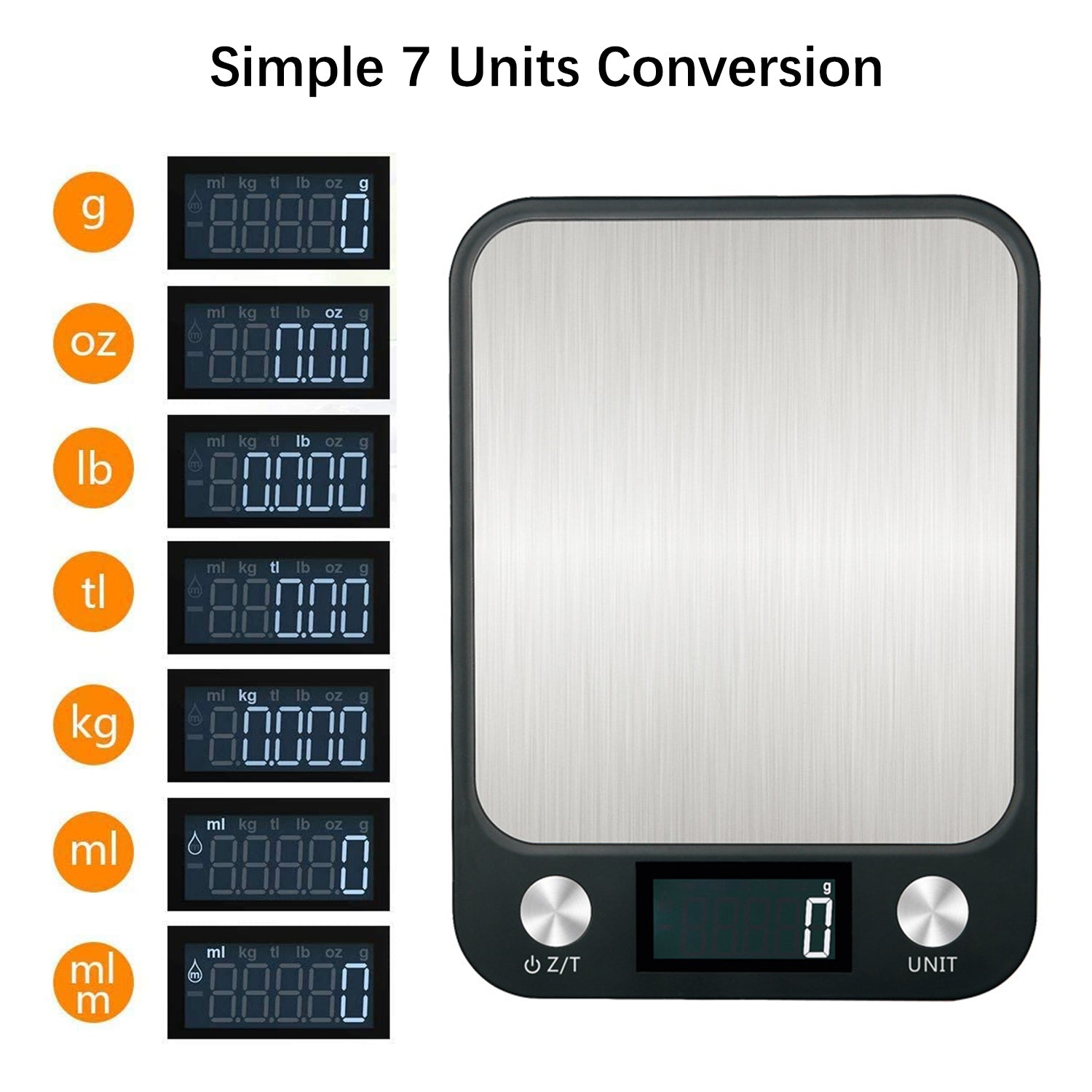 High Accuracy: With a weight capacity of 33 pounds (15 kilograms) and graduation of 0.1 ounces (1 gram), our digital kitchen scale has the accuracy to meet your personal and commercial needs. The compact and lightweight design makes it ideal for homes, kitchens, offices, and more. The scale clearly displays measurement results in kg,g, lb, oz, tl, ml on the digital LCD display the instant any weight is applied.