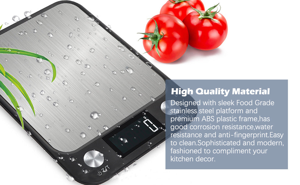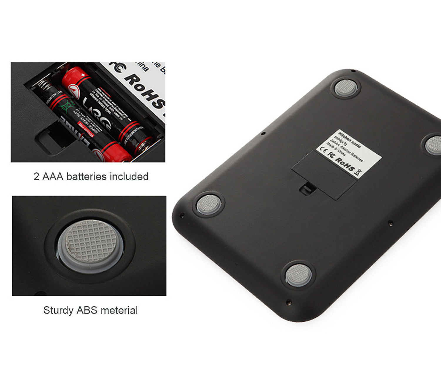 Stainless steel: Crafted with a durable, easy-to-clean, Anti-Fingerprint stainless steel surface and adds an elegant touch to your kitchen. The Premium ABS plastic frame is very strong and not so easy to break. Four anti-skid pads on the bottom and rounded corner design make the scale more stable and safe to use.