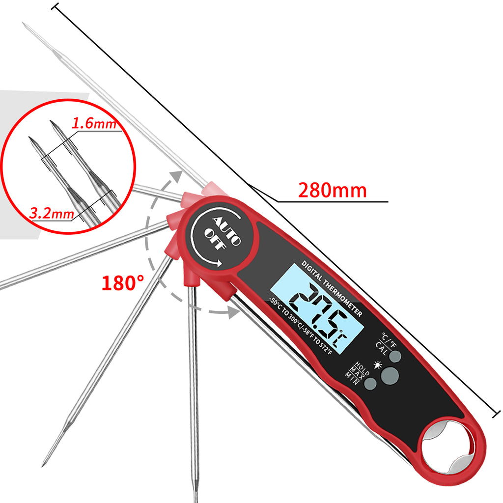 【Easy to Storage】The compact size(6.6x1.9x1.1inch) and the foldable probe is easy to storage. Two strong internal magnets can be easily attached to a fridge or steel surface. The bottle opener, can also be used as a hanging hole, allows you to hang it on the wall.