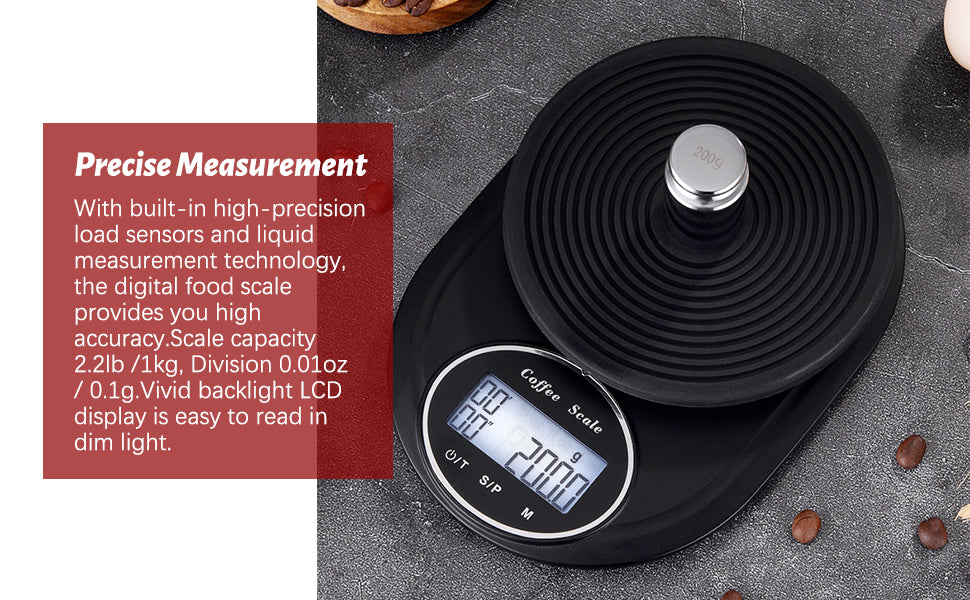 【Precise Measurement】With built-in high-precision load sensors and liquid measurement technology, the digital food scale provides you with high accuracy.Scale capacity 2.2lb /1kg, Division 0.01oz / 0.1g.The vivid backlight LCD display is easy to read in dim light.