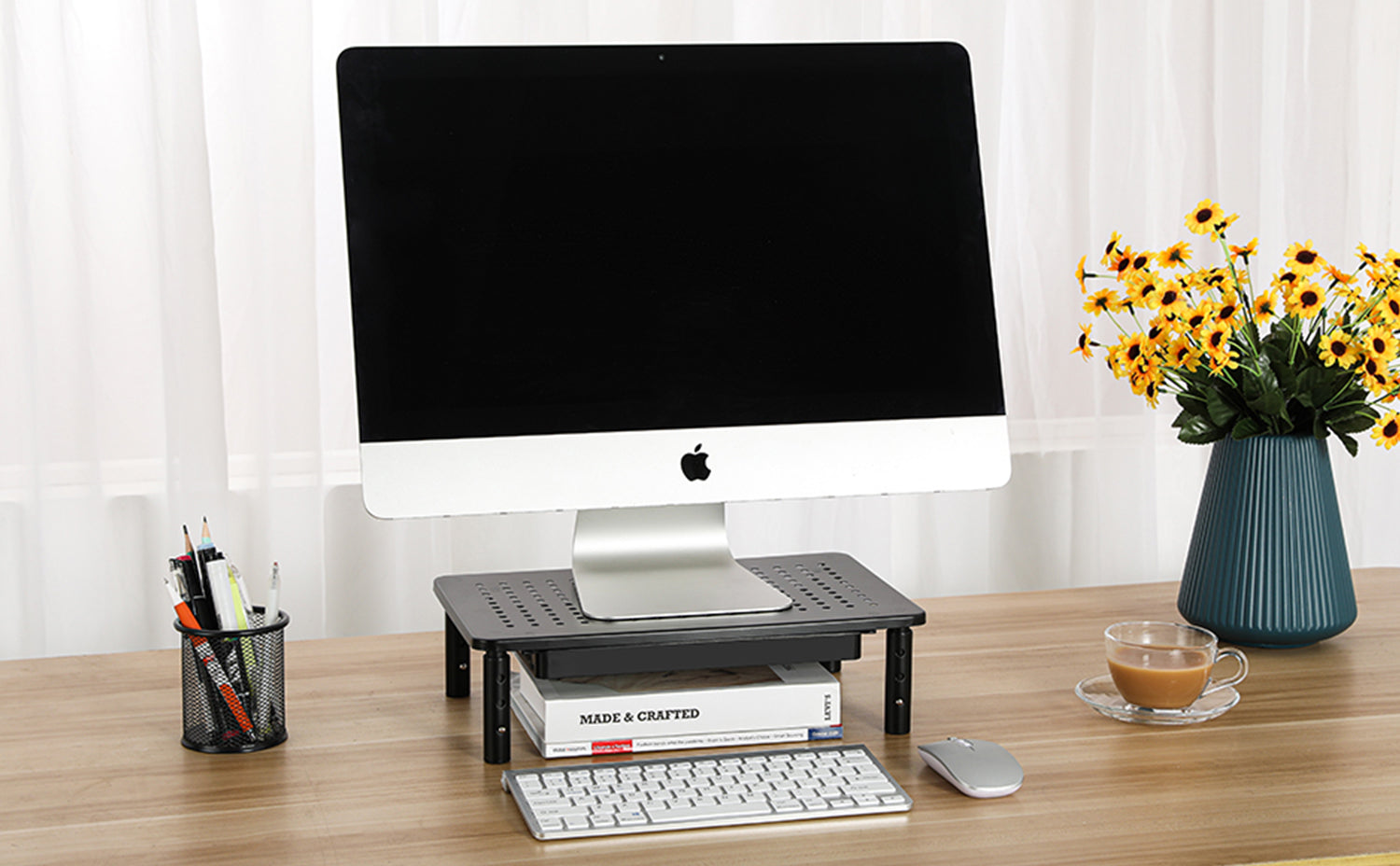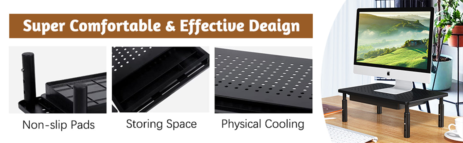 【Effective Heat Dissipation】Ventilated mesh platform of the monitor stand increases the airflow going toward your device. This keeps the laptop or monitor cooler and helps prevent overheating.