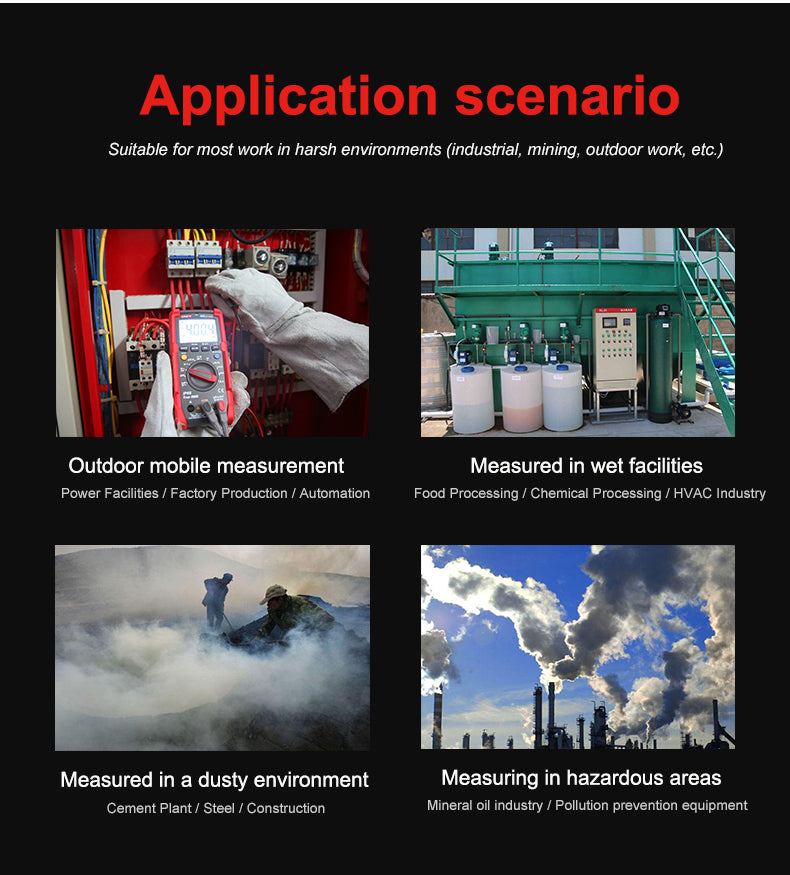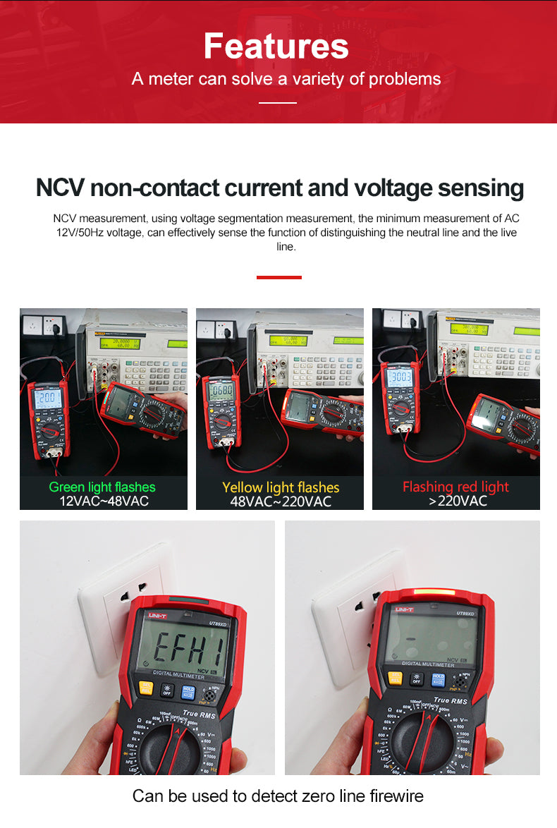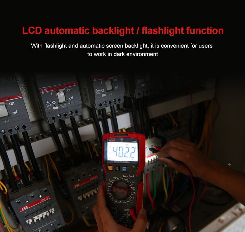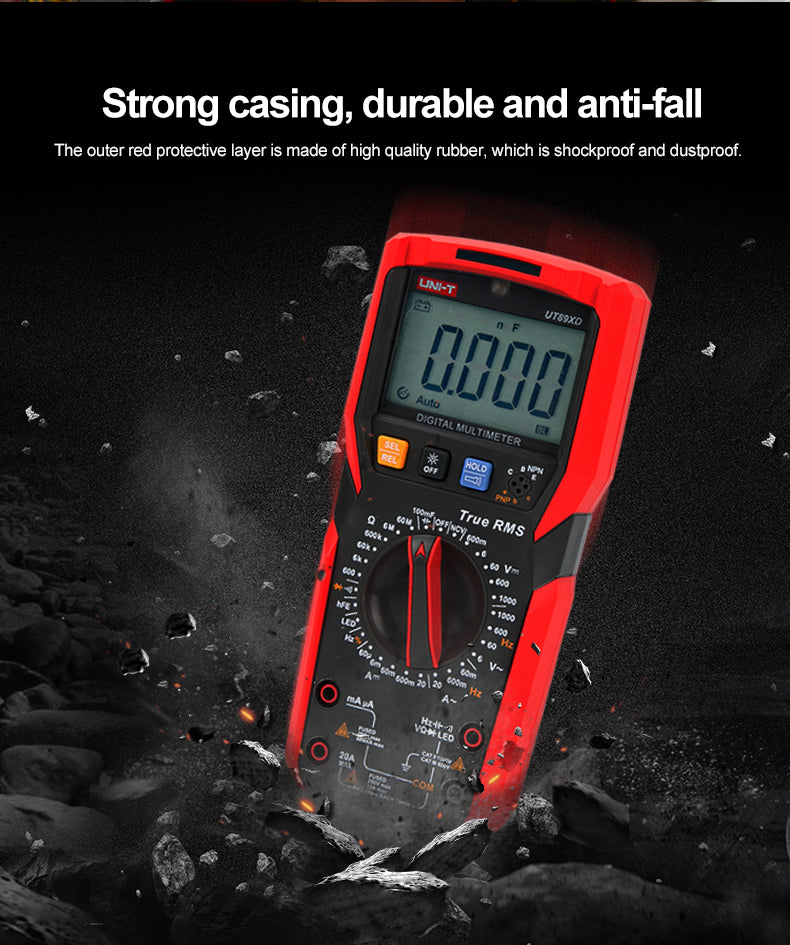 UT89XD is a reliable hand-held 3 5/6 bit digital multimeter with true RMS sine wave measurement. It can measure Max. 1000V DC/AC voltage, Max. 20A DC/AC current, resistance, capacitance, frequency, diode, hFE, continuity and NCV, quickly distinguishing between neutral and live wires accurately. UT89XD can perform LED test. Equipped with audible and visible alarm, flashlight and auto backlight functions, this series can be used in dark environment. It attracts users with its bi-color durable case, modern exterior and multiple functions.
