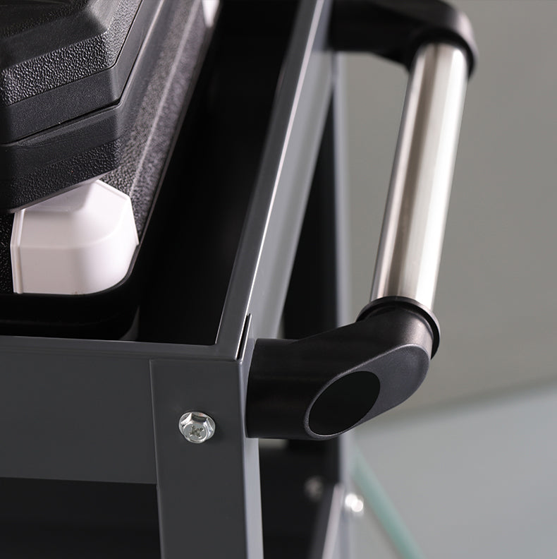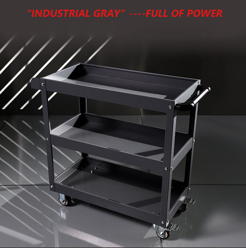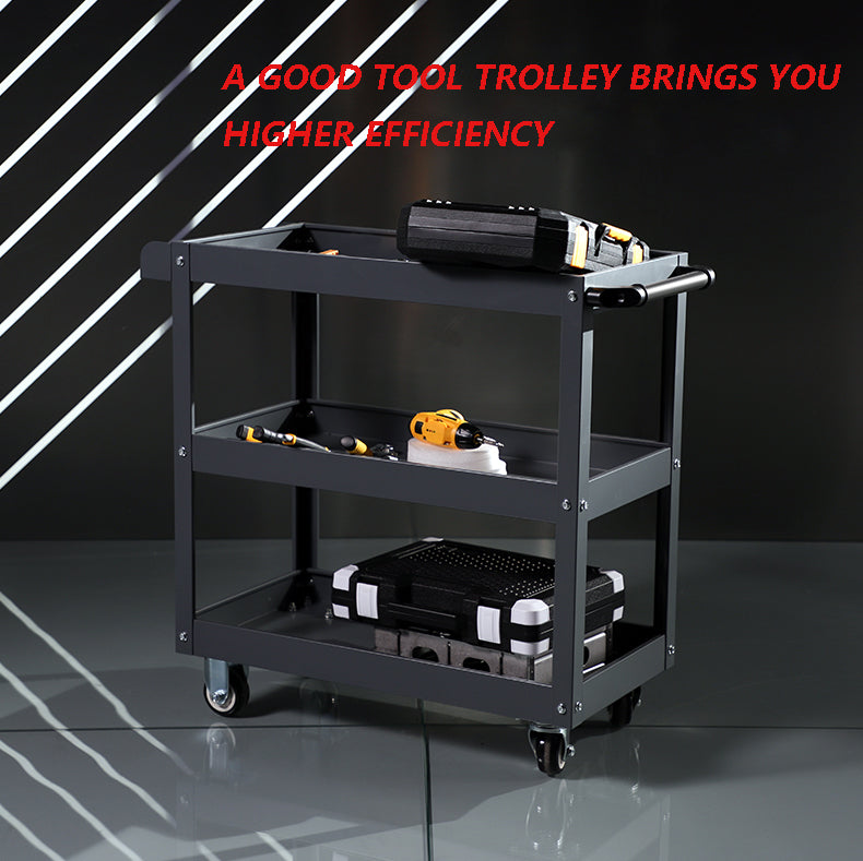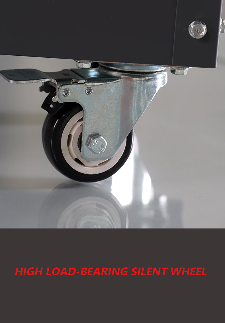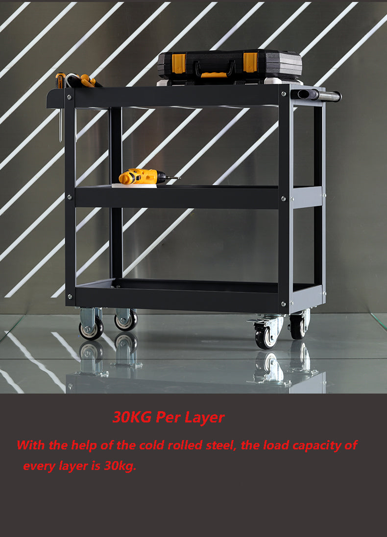 This tool trolley is made of cold rolled steel. With the help of the cold rolled steel, the load capacity of every layer is 66lbs. So, this is a stable tool trolley. The material of the car handle is steel and pp which is anti-rust and preservative. At the same time, the wheel has a high load capacity and is silent.