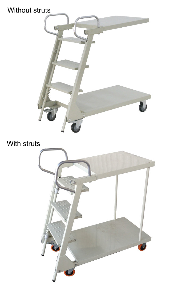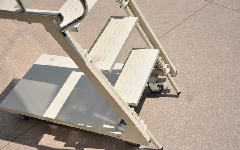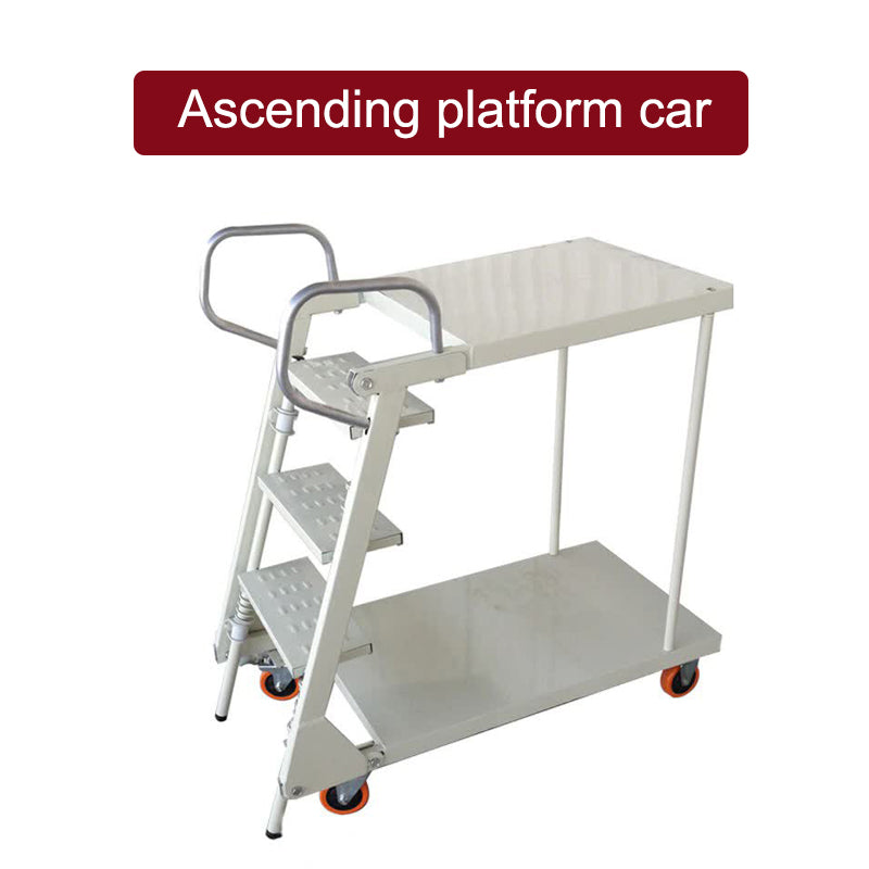 Folding warehouse to pick up the cargo ascending platform truck: the three-stage pedal is convenient for ascending and picking up the cargo. Two-layer platform shelf saves effort and time. Comes with casters, easy to move.