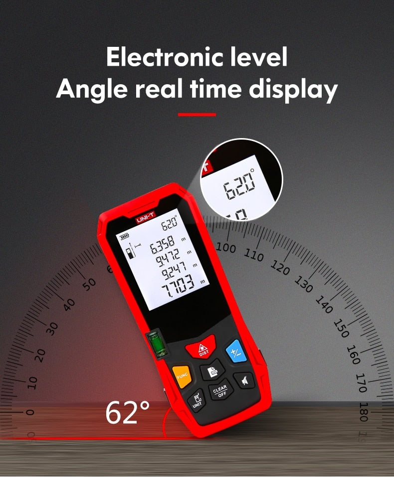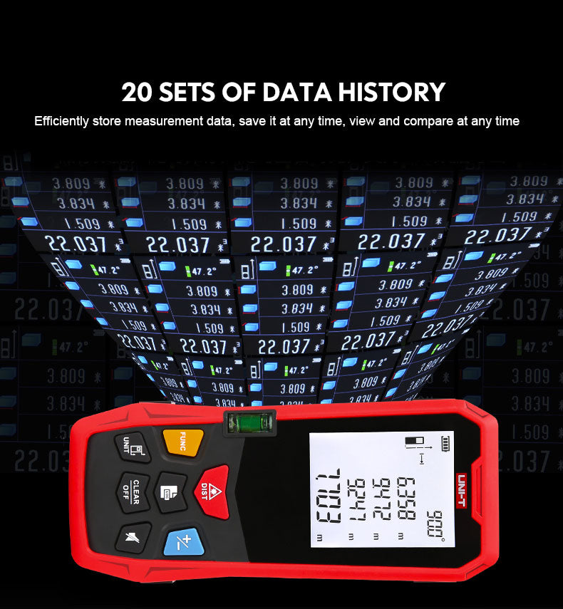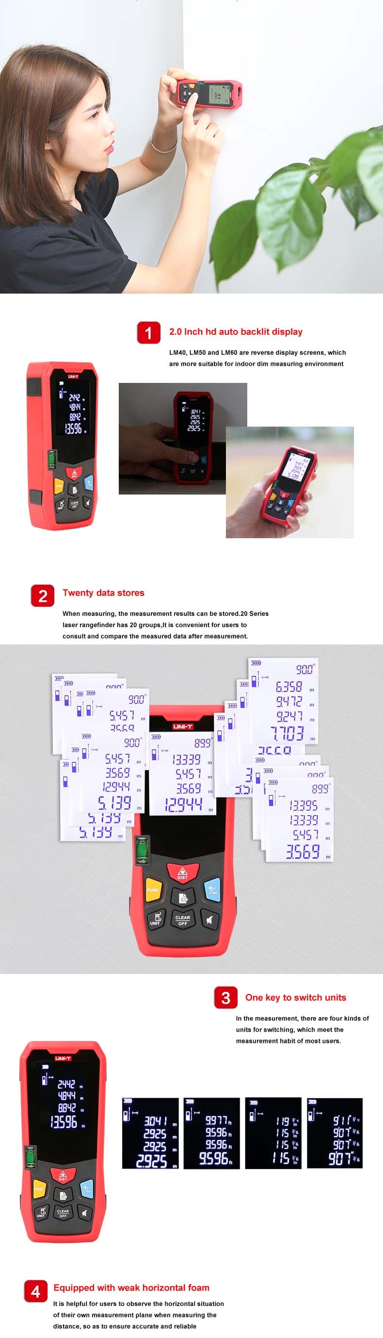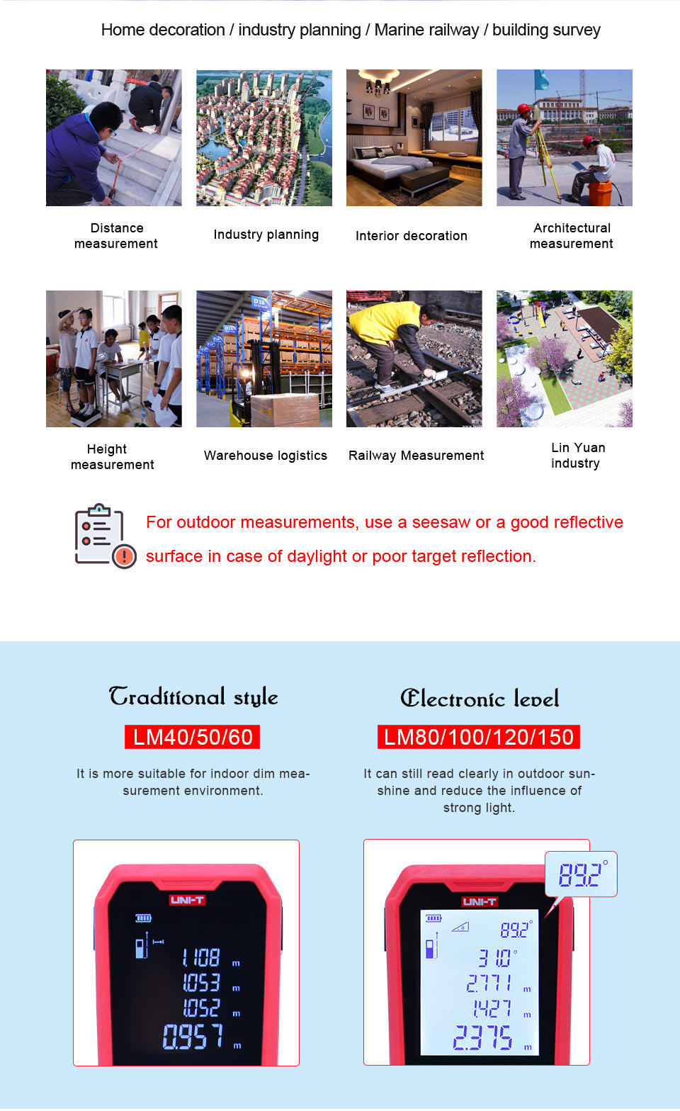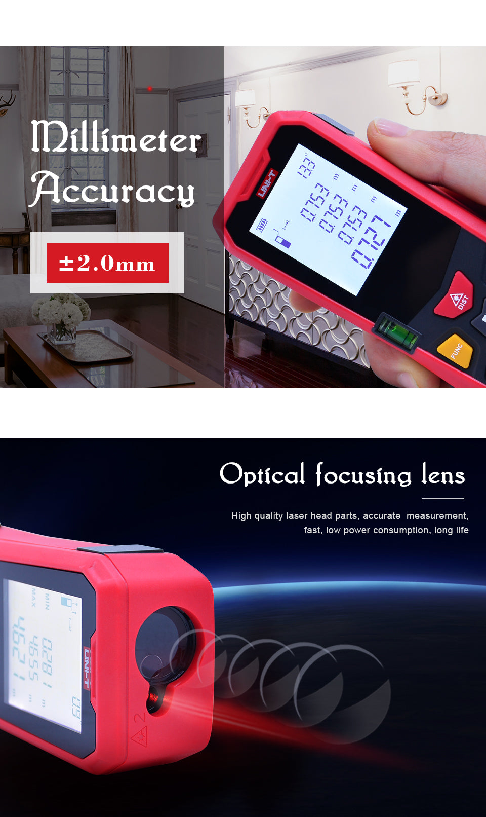 UNI-T LM100 laser distance meters are high precision laser distance meters designed for a wide range of professional industries such as construction, decoration, property management, transportation, firefighting, gardening, city planning and management, water conservancy testing, and electrical power maintenance.
