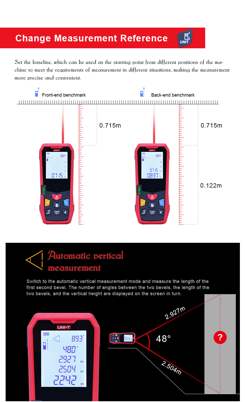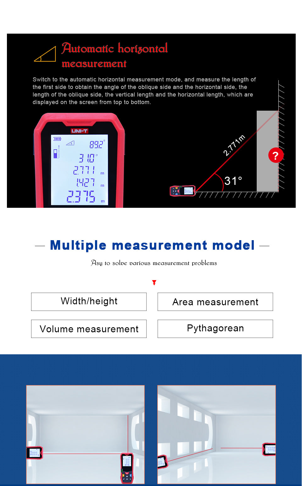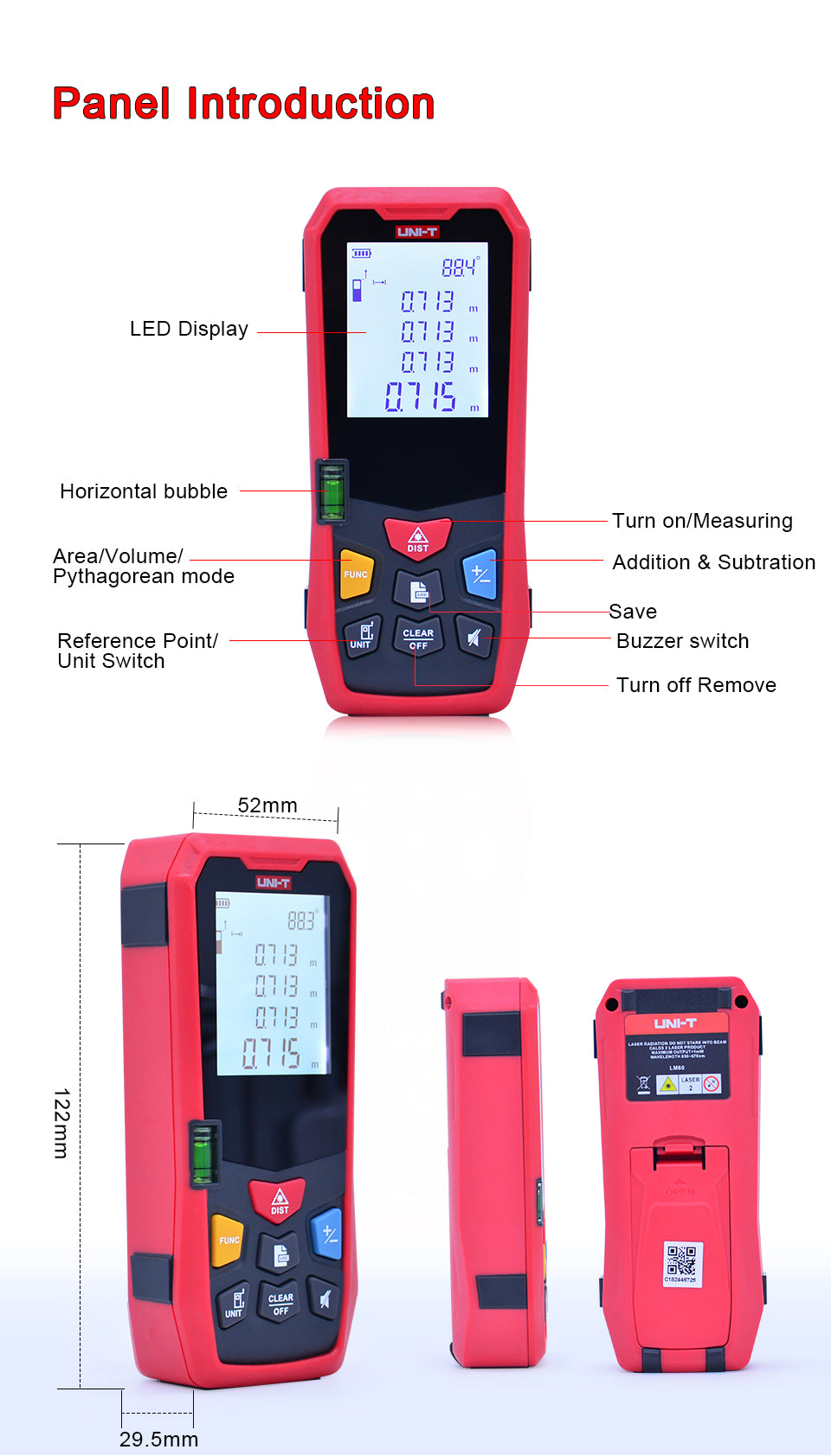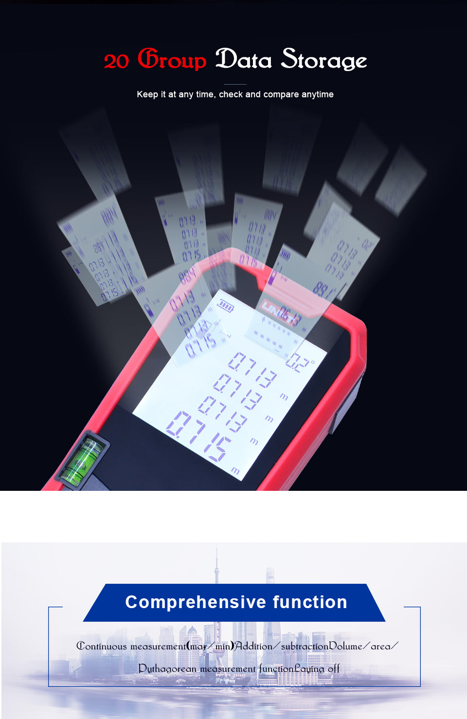 UNI-T LM100 laser distance meters are high precision laser distance meters designed for a wide range of professional industries such as construction, decoration, property management, transportation, firefighting, gardening, city planning and management, water conservancy testing, and electrical power maintenance.