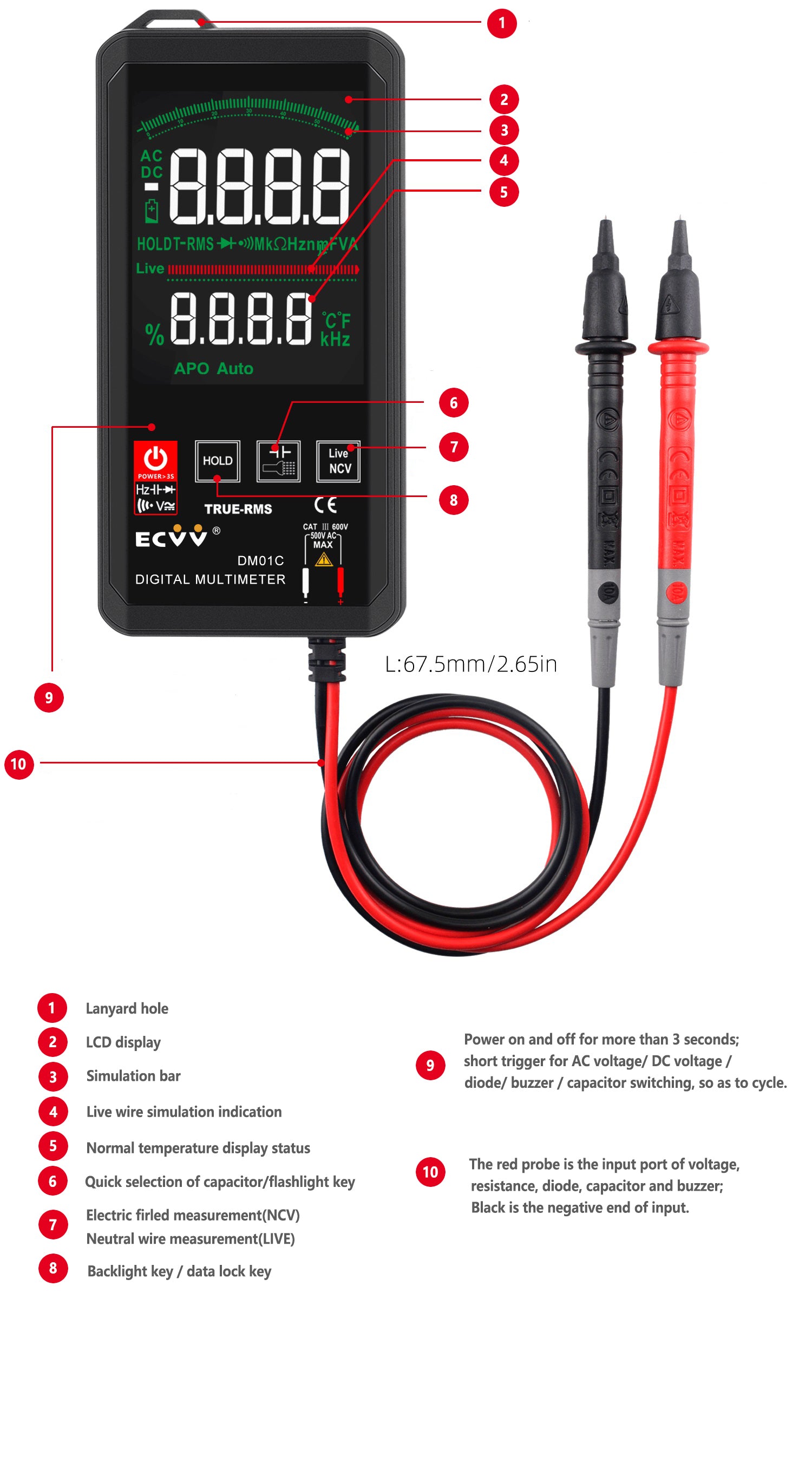 There is no need to turn the dial to select the function. The meter will automatically recognize and measure based on the input AC or DC current/resistance. It has stable performance, high precision, high reliability, clear reading and overload protection. Driven by AAA 1.5V battery, the instrument adopts large-screen LCD display and adopts a boost power supply.