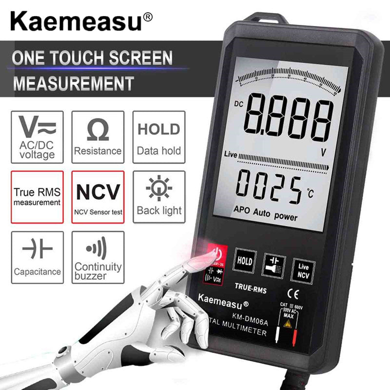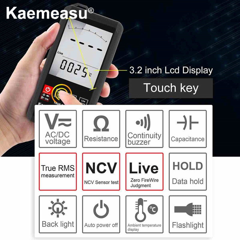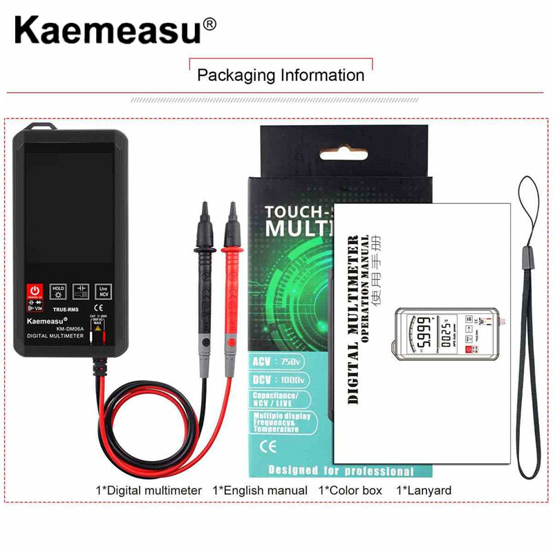 DC voltage DCV: 6V/60V/600V/1000V AC voltage ACV: 6V/60V/600V/750V Resistor: 600Ω/6kΩ/60kΩ/600kΩ/6MΩ/60MΩ Capacitor: 10nF/100nF/1uF/10uF/100uF/1mF/10mF/60mF Diode /Continuity test: √ Touch key: √ Continuous power operation: √ NCV : √ Zero line / Fire line test: √ Full unit symbol: √ Backlight manual/Auto off: √ True RMS measurement: √ Temperature(℃/H): √ Flashlight lighting: √ Model: KM-DM06A