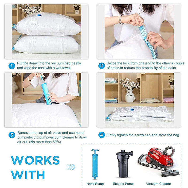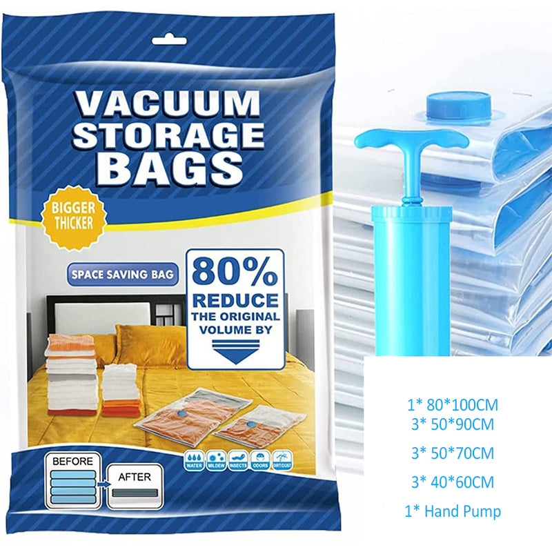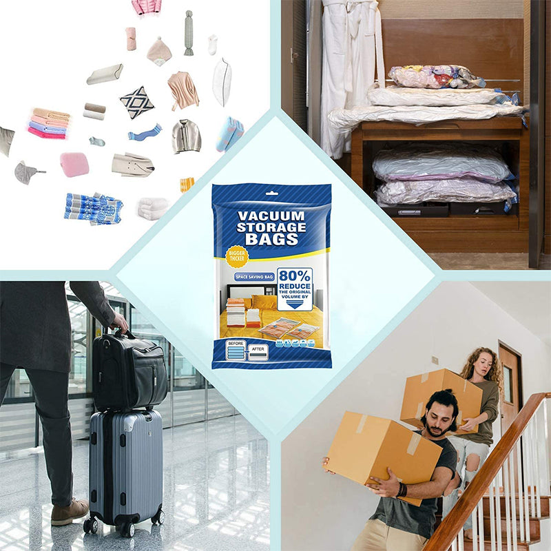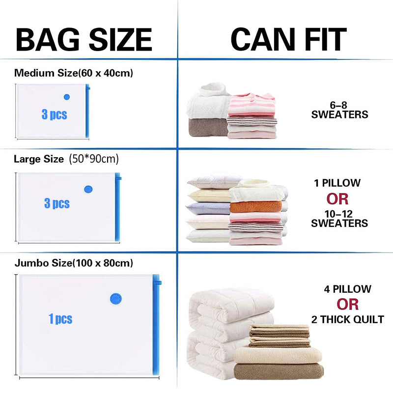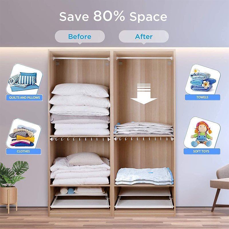 [Increase Storage Space]: When you go crazy with many clothes, quilts and blankets, without having to clean out your closet! Our vacuum storage bags are an ideal solution for adding more storage space to your wardrobes, closets, garages, basements, lofts, and suitcases.