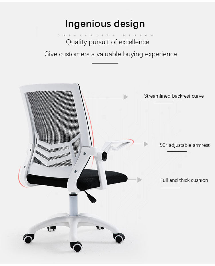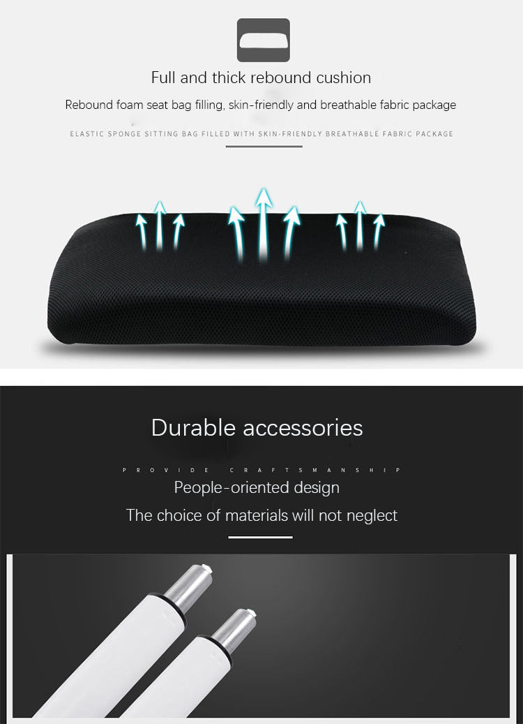 Use high rebound native sponge and breathable net fabric, good elasticity, moderate softness, fit the body hip curve, cushion pressure distribution is uniform, do not squeeze the legs, reduce the pressure on the spine, widening the seating surface design, to give you a more comfortable office, game experience;