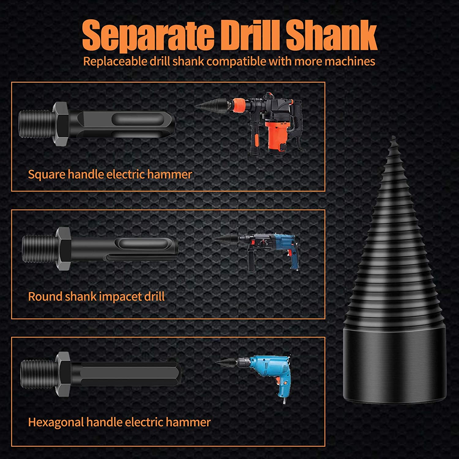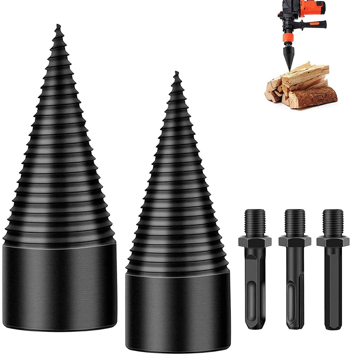 [Multiple Choices] It comes 32mm Wood Splitter Drill + 42mm Wood Splitter Drill + Round + square + hexagon handle set, different drill bits size are available for different electric drills. Choosing the right drill for your electric drill, easy to install and fast to use.
