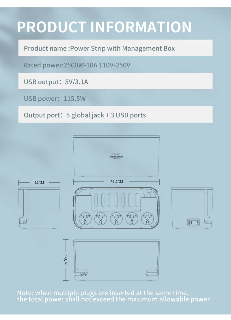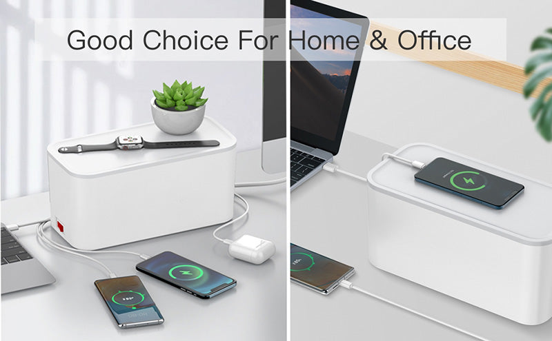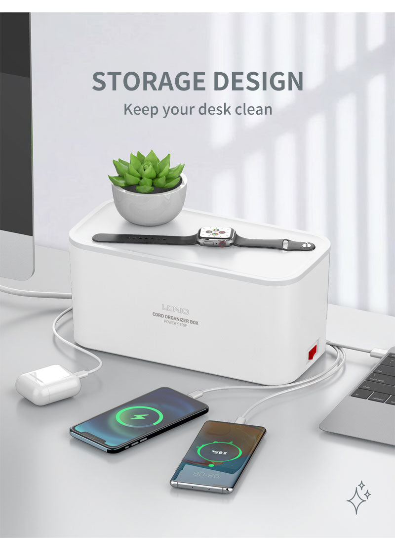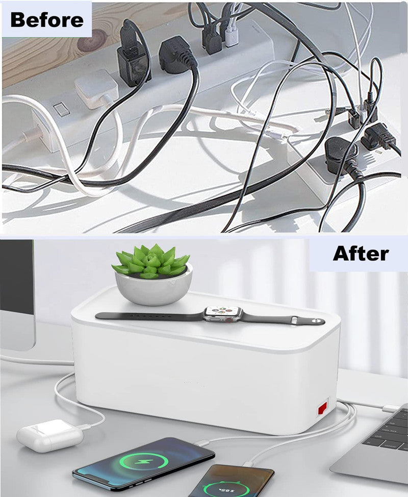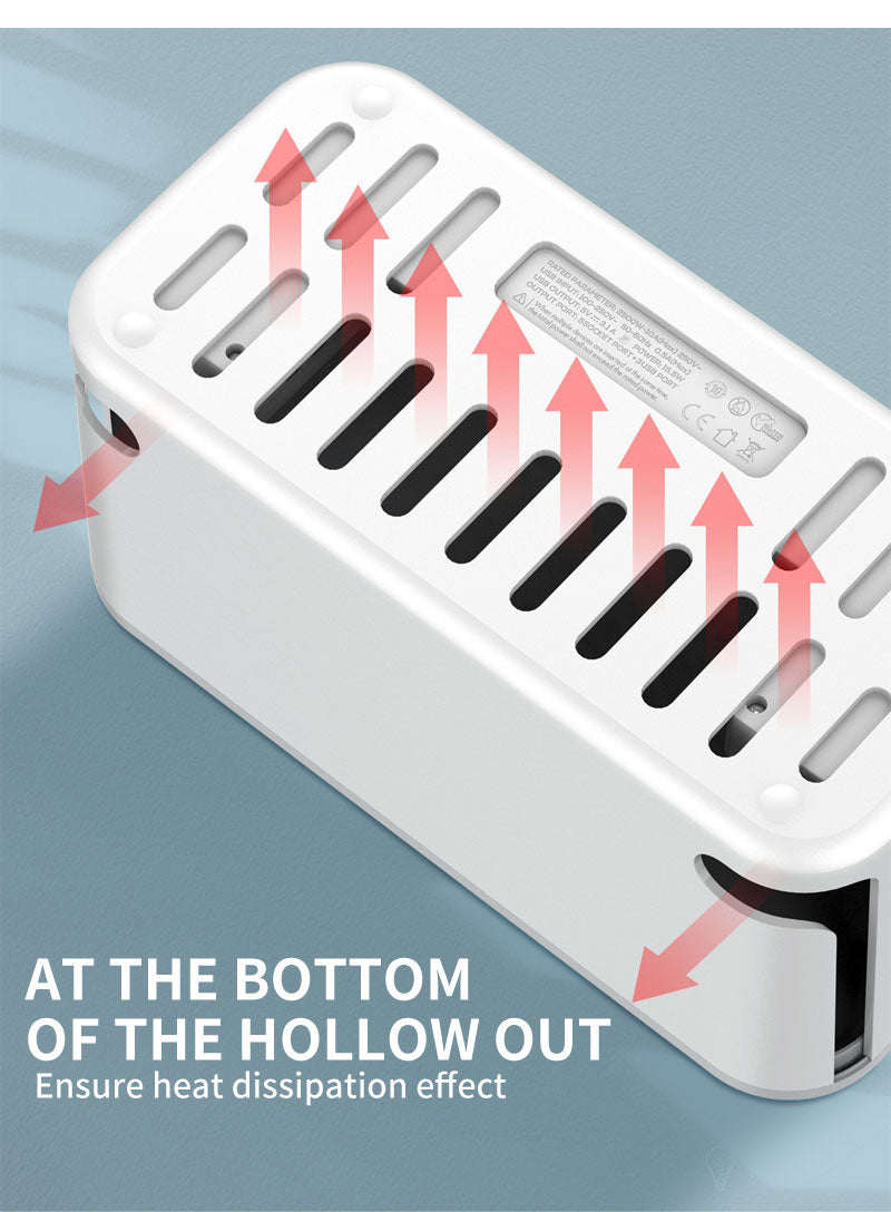 Creative Modern Design】Our Power extension cord with box organizer, hollow-carved designed at the bottom of the box provides ventilation to help dissipate heat, durable and solid build uses exceptional fire-redundant PC material, compact and space-saving size, and a hidden power button on the side.Cable Management Box size L29.4xH14xW14cm .