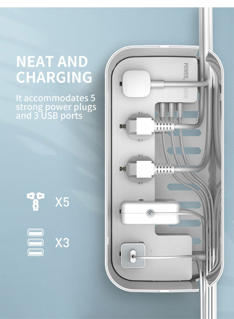 5 Outlets Power Extension & 3 USB & Cable Management Box