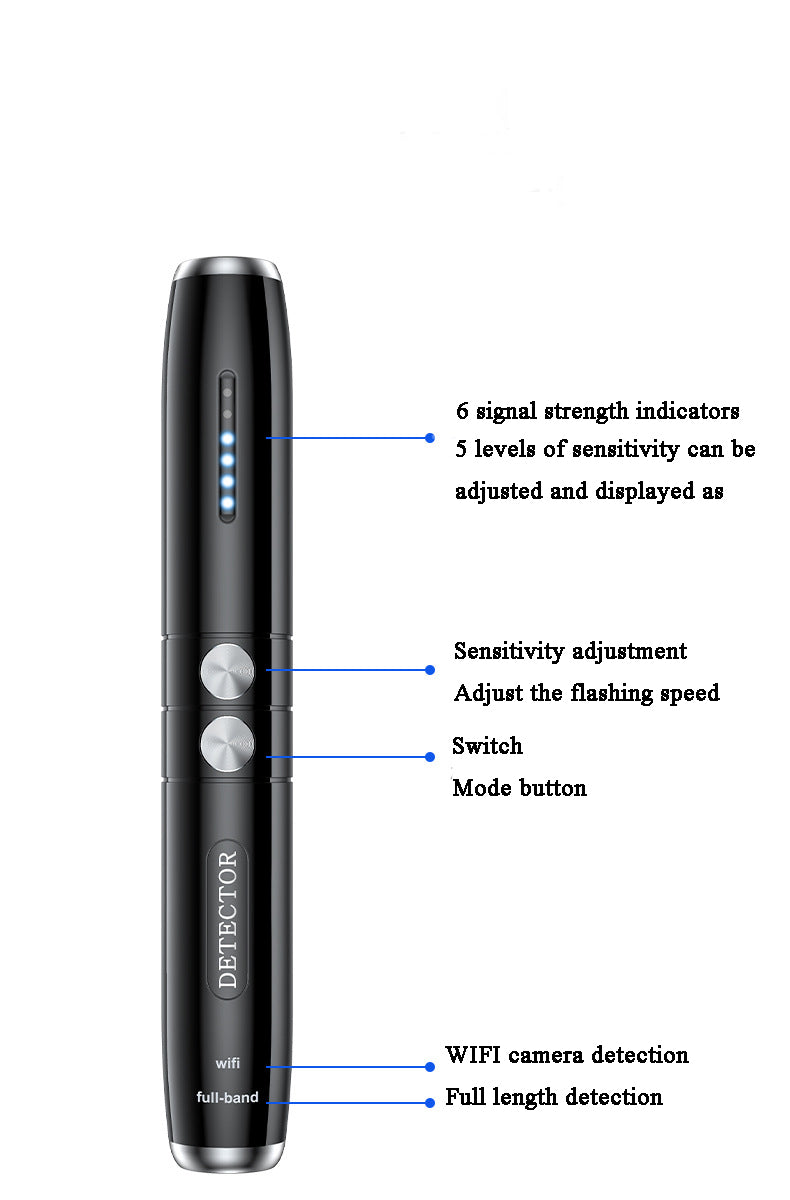 - [WIFI detect]: Detect wireless hidden cameras, Radio wave (wireless camera/bug); Full-band Full band detection.