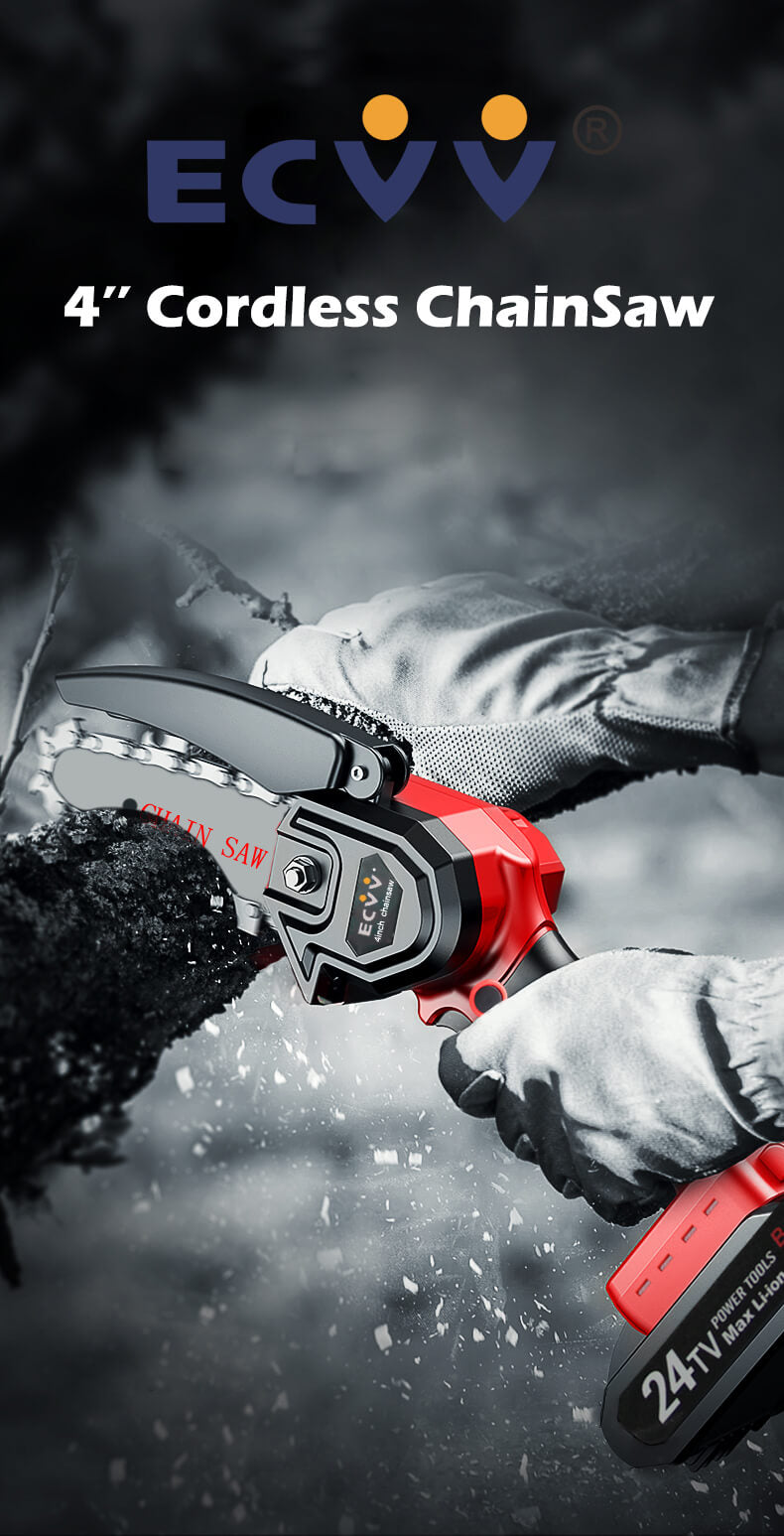 ECVV mini chainsaw weighs only 1130g (including the weight of the battery), small and light, and girls can also hold it with one hand. The mini chainsaw has a safety cover flip to prevent sawdust splashing and protect your personal safety. At the same time, it is equipped with a non-slip handle to prevent the mini chainsaw from slipping off accidentally during use. It comes with a spare battery to prevent you from suddenly running out of power when using the mini chainsaw.