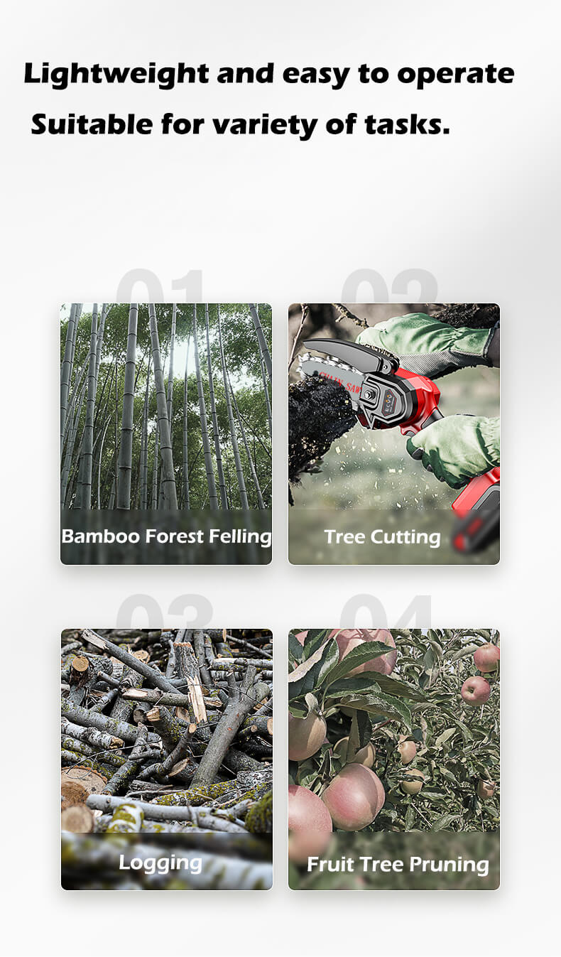 The powerful chain saw can cut logs with a diameter of 0~15cm in a short time (it is recommended to build small branches). This kind of chainsaw is very suitable for wood cutting, potted plant construction, branch pruning in the courtyard garden, gardening.